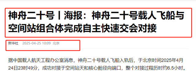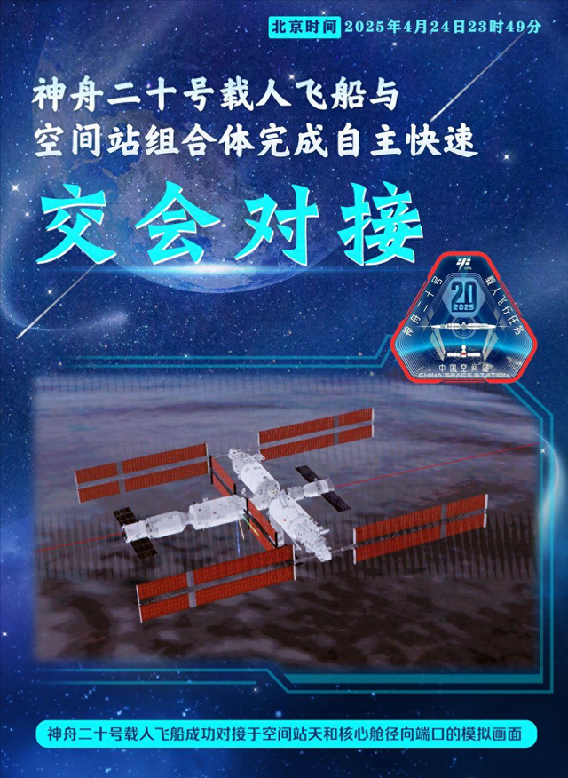 新华社 2025-04-25 《神舟二十号|海报:神舟二十号载人飞船与空间站组合体完成自主快速交会对接》